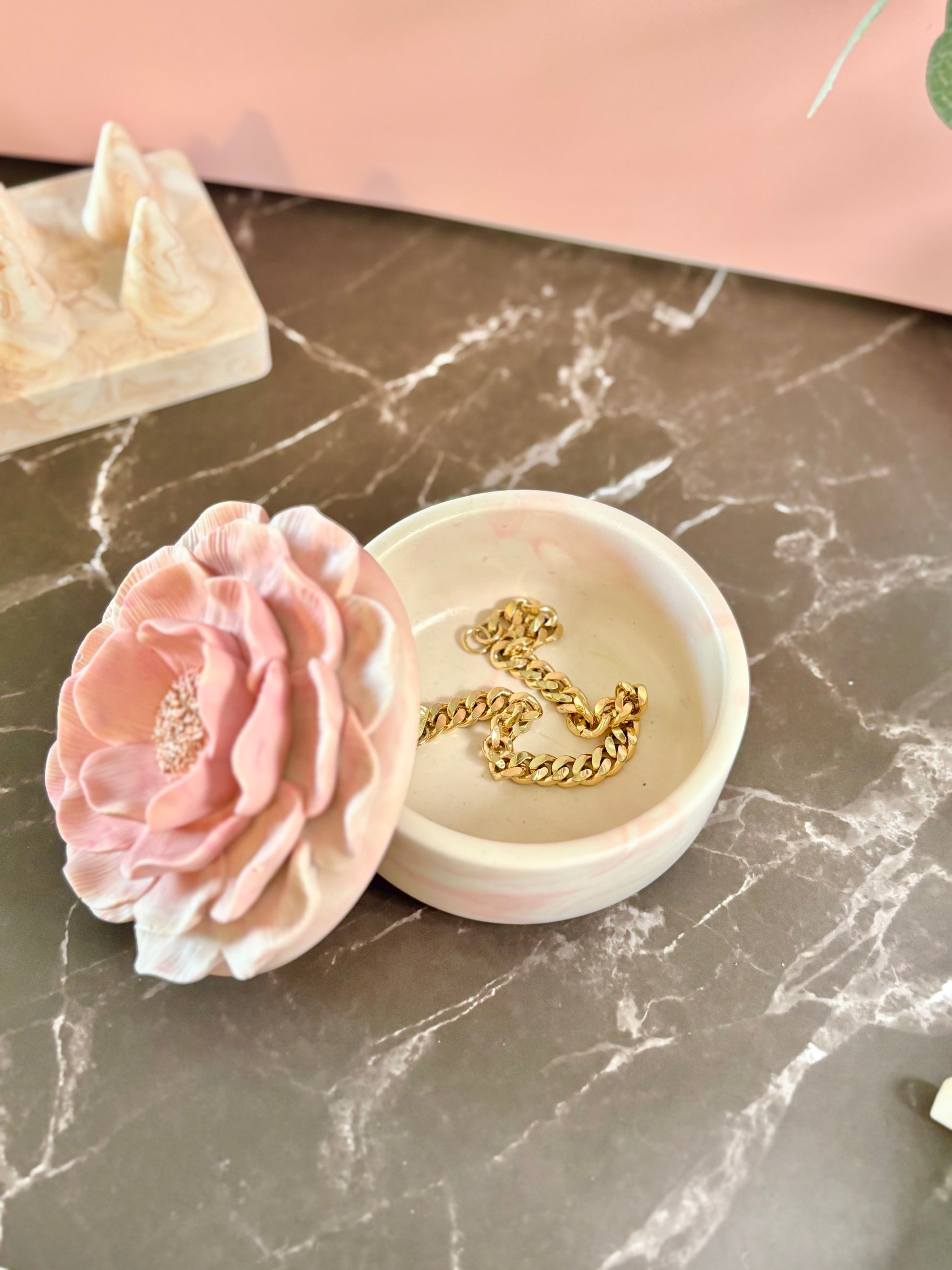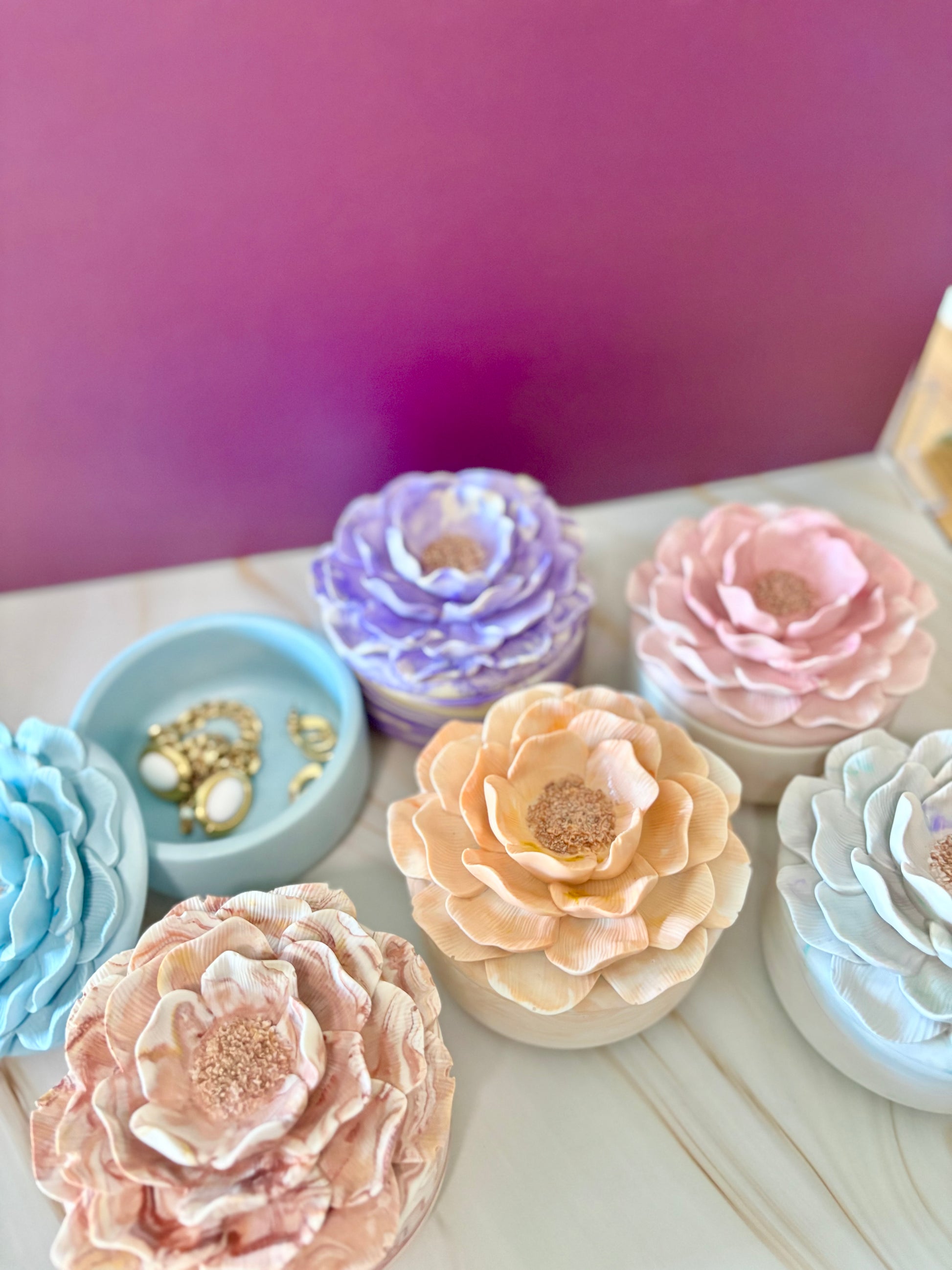 Questo elegante vasetto in eco-resina è interamente realizzato a mano e impreziosito da un coperchio decorato da un fiore di Camelia in rilievo. La sua base versatile può trasformarsi in una candela profumata grazie alle candele Refill Kookie, oppure diventare un porta-oggetti o porta-gioie prezioso per arredare ogni angolo della tua casa.