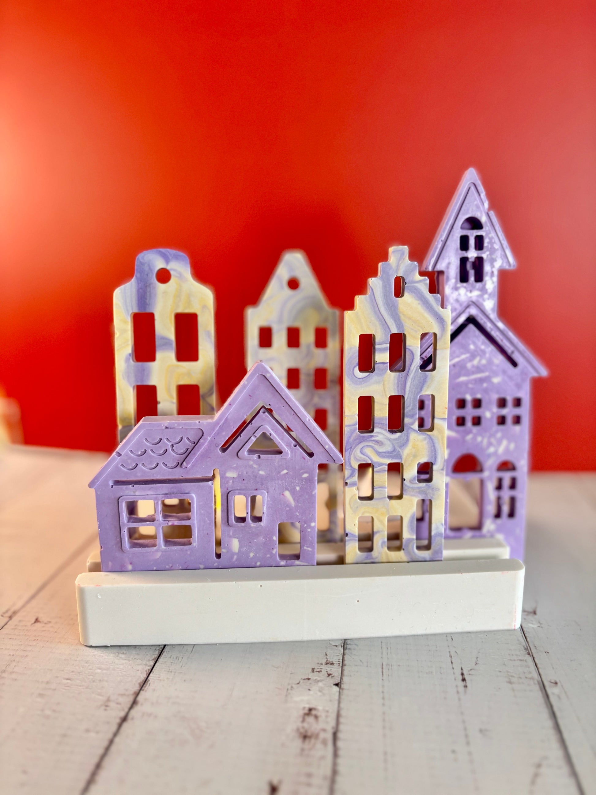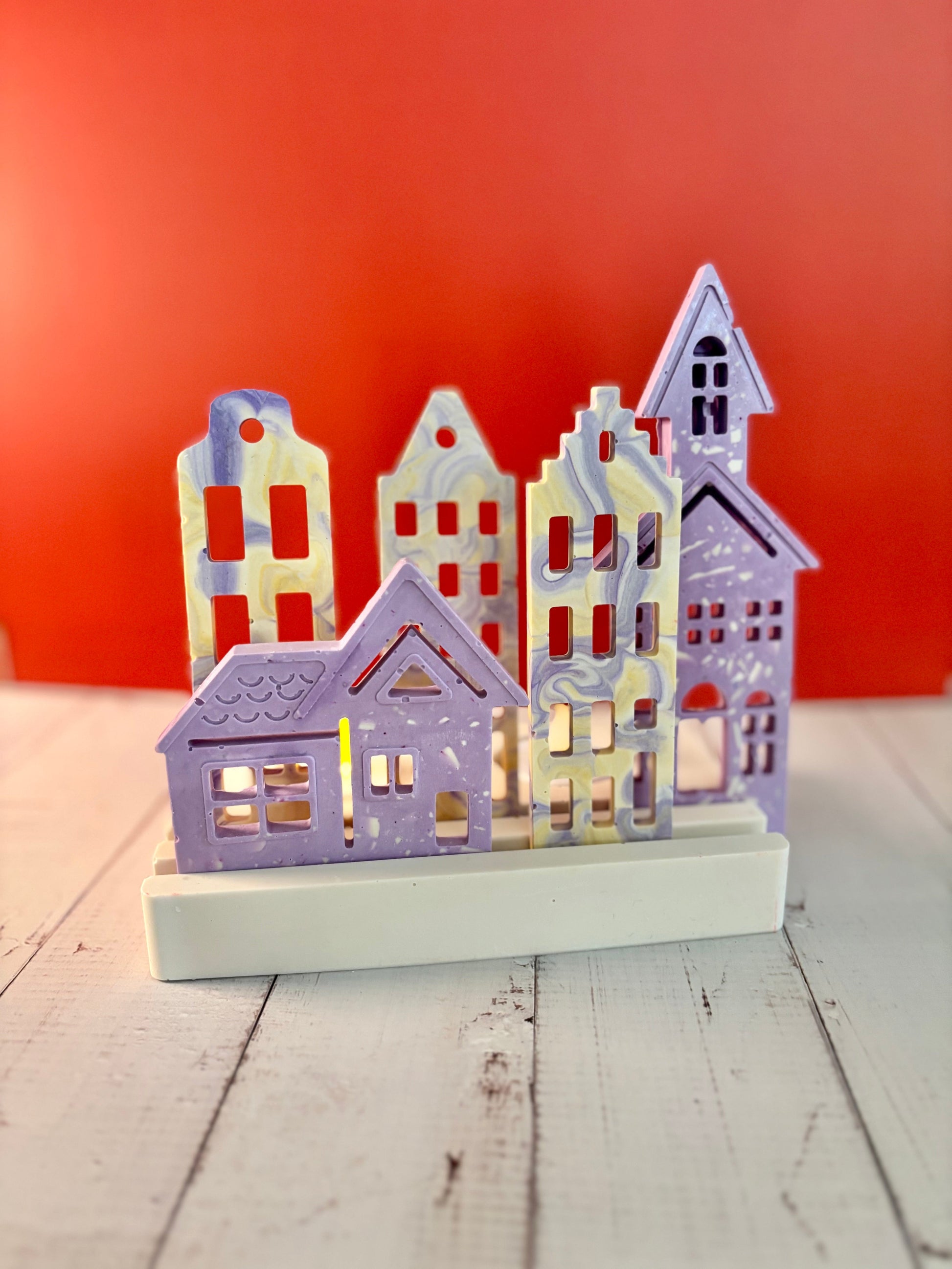 Aggiungi un tocco di atmosfera calda e accogliente alla tua casa con questo elegante set di casette in stile olandese, realizzate interamente a mano in eco resina. La base bianca è pensata per ospitare due lumini (classico o LED), così da illuminare le casette e creare un’atmosfera accogliente, perfetta per il periodo natalizio ma anche per tutto l’anno.